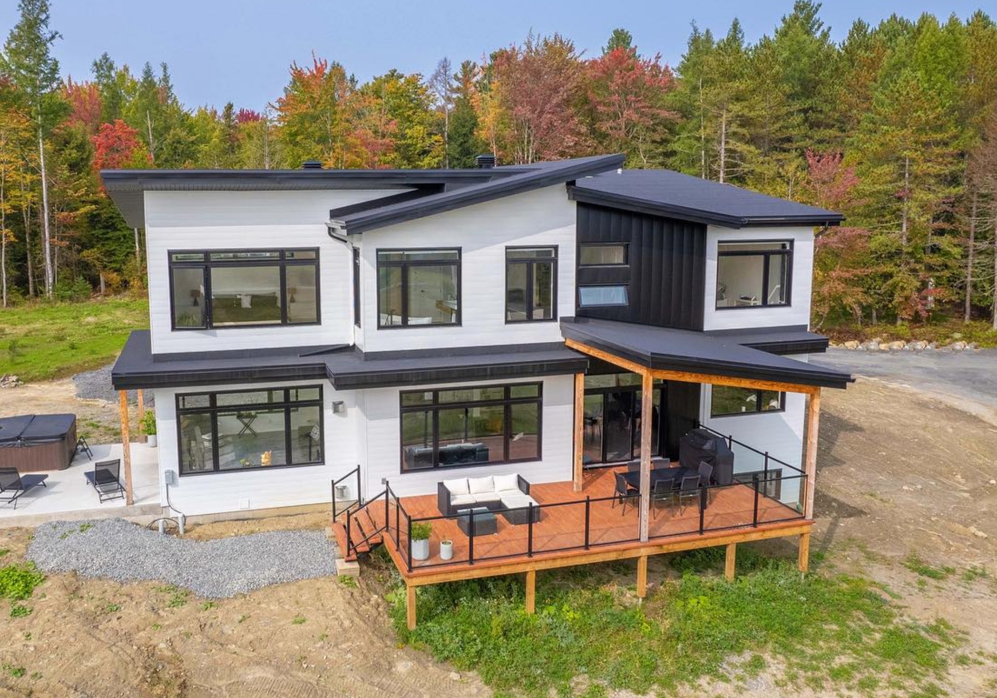 Cette maison distinction contemporaine, offrant une vue imprenable sur le lac Memphrémagog, allie modernité et confort. Ses toits monopentes et sa grande fenestration inondent les espaces de vie à aire ouverte de lumière naturelle. Le bois et les tons pâles contrastent avec les éléments noirs raffinés et les armoires de cuisine gris foncé, créant un intérieur élégant et harmonieux.