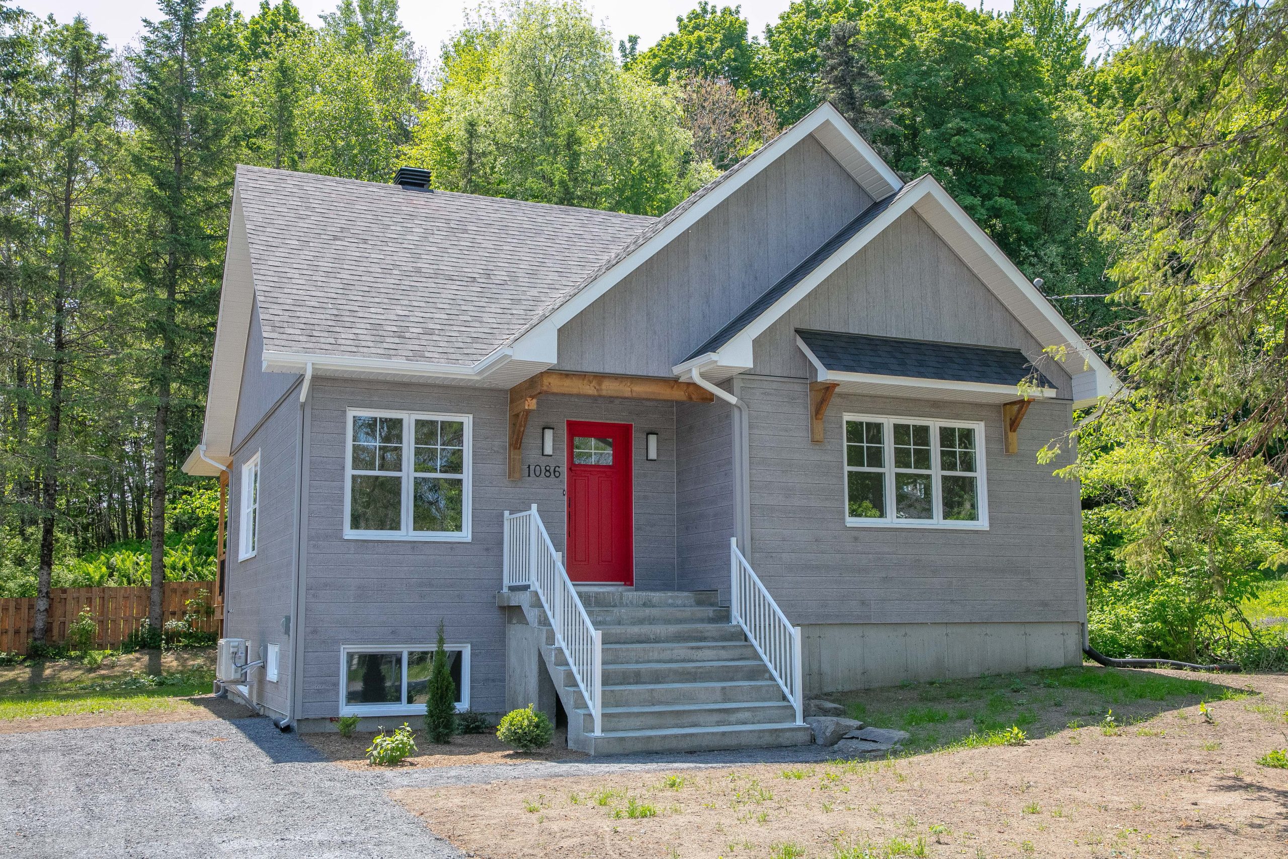 Cette maison neuve, à l’allure chaleureuse et contemporaine, séduit par son extérieur gris, sa porte rouge et ses accents de bois. Les espaces intérieurs à aire ouverte, baignés de lumière, révèlent un subtil contraste entre planchers en bois pâle, armoires gris foncé, comptoir en quartz blanc et robinetterie dorée, pour un design harmonieux et élégant.